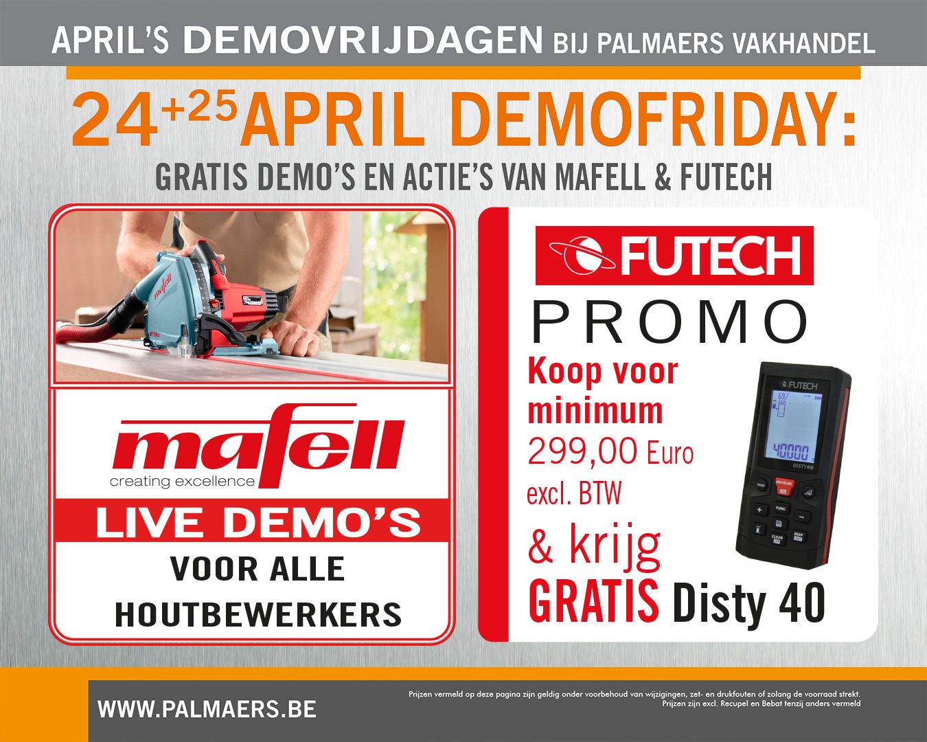 Let op: deze actie geldt enkel op 24 en 25 april. Bezoek ons in Tongersestraat 94, Bilzen, of contacteer ons via info@palmaers.be of +32 (0)89 41 10 59. Zo mist u deze gratis demo’s en FUTECH-actie niet.