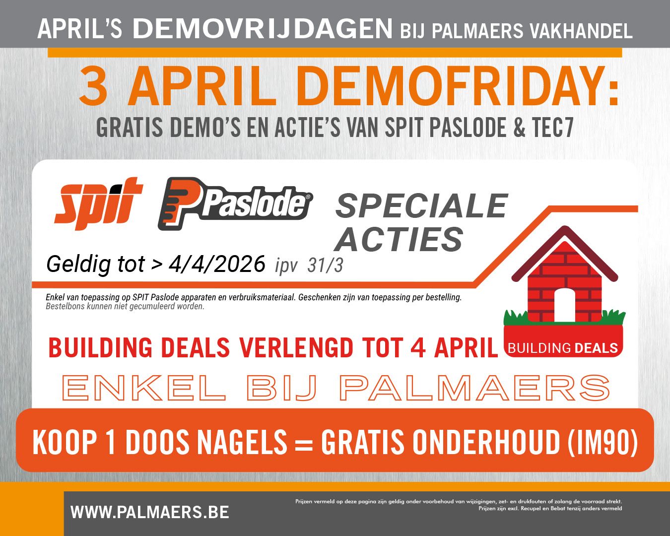 Wie tijdens de demofriday (3 april) met SPIT en Paslode aan de slag gaat, pikt extra voordeel mee. De Building Deals lopen exclusief bij ons door tot en met 4 april. Bovendien krijgt u bij aankoop van 1 doos nagels een gratis onderhoud van uw IM90xi. Meer details vindt u op de pagina met SPIT Paslode Building Deals.